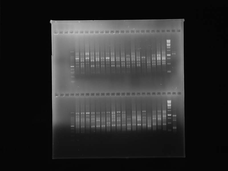 对,是做的植物的ISSR亲缘关系,图是为了以后聚类用的,现在重新灭菌水呢,希望不是试剂污染了,否则耽误时间。