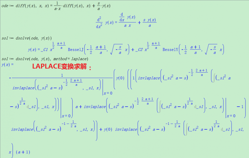 但是,反过来 ans=a*diff(Y,x,2)-diff(Y,x)/x-s*Y ans = a*(C3*x^((a + 1)/(2*a))*((s^(1/2)*((besselk(1 - (a + 1)/(2*a), -(s^(1/2)*x)/a^(1/2))*((a + 1)/(2*a) - 1))/x + (s^(1/2)*besselk(-(a + 1)/(2*a), -(s^(1/2)*x)/a^(1/2)))/a^(1/2)))/a^(1/2) + (besselk(-(a + 1)/(2*a), -(s^(1/2)*x)/a^(1/2))*(a + 1))/(2*a*x^2) - ((a + 1)*((s^(1/2)*besselk(1 - (a + 1)/(2*a), -(s^(1/2)*x)/a^(1/2)))/a^(1/2) - (besselk(-(a + 1)/(2*a), -(s^(1/2)*x)/a^(1/2))*(a + 1))/(2*a*x)))/(2*a*x)) + (C2*x^((a + 1)/(2*a))*((s^(1/2)*((besseli(1 - (a + 1)/(2*a), (s^(1/2)*x)/a^(1/2))*((a + 1)/(2*a) - 1))/x + (s^(1/2)*besseli(-(a + 1)/(2*a), (s^(1/2)*x)/a^(1/2)))/a^(1/2)))/a^(1/2) + (besseli(-(a + 1)/(2*a), (s^(1/2)*x)/a^(1/2))*(a + 1))/(2*a*x^2) - ((a + 1)*((s^(1/2)*besseli(1 - (a + 1)/(2*a), (s^(1/2)*x)/a^(1/2)))/a^(1/2) - (besseli(-(a + 1)/(2*a), (s^(1/2)*x)/a^(1/2))*(a + 1))/(2*a*x)))/(2*a*x)))/(-1)^((a + 1)/(2*a)) + (C3*x^((a + 1)/(2*a) - 1)*(a + 1)*((s^(1/2)*besselk(1 - (a + 1)/(2*a), -(s^(1/2)*x)/a^(1/2)))/a^(1/2) - (besselk(-(a + 1)/(2*a), -(s^(1/2)*x)/a^(1/2))*(a + 1))/(2*a*x)))/a + (C3*x^((a + 1)/(2*a) - 2)*((a + 1)/(2*a) - 1)*besselk(-(a + 1)/(2*a), -(s^(1/2)*x)/a^(1/2))*(a + 1))/(2*a) + (C2*x^((a + 1)/(2*a) - 1)*(a + 1)*((s^(1/2)*besseli(1 - (a + 1)/(2*a), (s^(1/2)*x)/a^(1/2)))/a^(1/2) - (besseli(-(a + 1)/(2*a), (s^(1/2)*x)/a^(1/2))*(a + 1))/(2*a*x)))/((-1)^((a + 1)/(2*a))*a) + (C2*x^((a + 1)/(2*a) - 2)*((a + 1)/(2*a) - 1)*besseli(-(a + 1)/(2*a), (s^(1/2)*x)/a^(1/2))*(a + 1))/(2*(-1)^((a + 1)/(2*a))*a)) - (C3*x^((a + 1)/(2*a))*((s^(1/2)*besselk(1 - (a + 1)/(2*a), -(s^(1/2)*x)/a^(1/2)))/a^(1/2) - (besselk(-(a + 1)/(2*a), -(s^(1/2)*x)/a^(1/2))*(a + 1))/(2*a*x)) + (C2*x^((a + 1)/(2*a))*((s^(1/2)*besseli(1 - (a + 1)/(2*a), (s^(1/2)*x)/a^(1/2)))/a^(1/2) - (besseli(-(a + 1)/(2*a), (s^(1/2)*x)/a^(1/2))*(a + 1))/(2*a*x)))/(-1)^((a + 1)/(2*a)) + (C3*x^((a + 1)/(2*a) - 1)*besselk(-(a + 1)/(2*a), -(s^(1/2)*x)/a^(1/2))*(a + 1))/(2*a) + (C2*x^((a + 1)/(2*a) - 1)*besseli(-(a + 1)/(2*a), (s^(1/2)*x)/a^(1/2))*(a + 1))/(2*(-1)^((a + 1)/(2*a))*a))/x - s*(C3*x^((a + 1)/(2*a))*besselk(-(a + 1)/(2*a), -(s^(1/2)*x)/a^(1/2)) + (C2*x^((a + 1)/(2*a))*besseli(-(a + 1)/(2*a), (s^(1/2)*x)/a^(1/2)))/(-1)^((a + 1)/(2*a))) 这回我不明白了 |