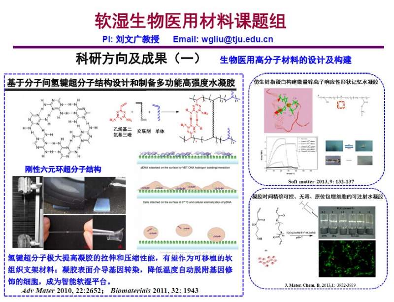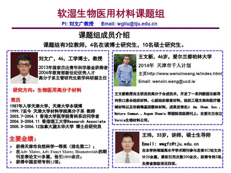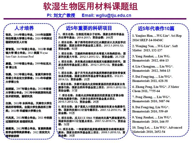 导师简介:刘文广 教授 博士生导师 天津大学材料学院高分子系教授 2013年国家杰出青年基金获得者 研究方向: 1:响应型水凝胶的设计和构建 2:基因载体 3:组织工程/细胞支架 课题组简介:见附件图片 联系方式:wgliu@tju.edu.cn 022-27402487 (office) 地址: 天津市天津大学第25楼C区504房间 1 .jpg 2.jpg 3.jpg 4.jpg 5.jpg [ Last edited by wwgfz on 2014-7-17 at 20:41 ] |