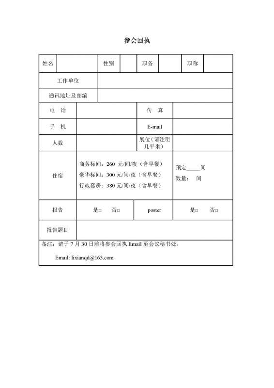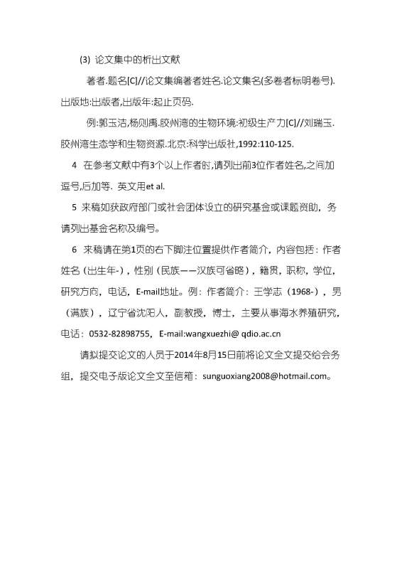 关于举办“第四届水产工业化养殖技术研讨会”的通知 (第二轮) 各有关单位和专家: “第四届水产工业化养殖技术暨封闭循环水养殖技术国际研讨会”定于2014年9月21日至9月23日在天津召开。会议主题为“工业化养殖—变革与创新”,本次会议采取大会主题报告与学术报告相结合的方式进行,届时将邀请国内外知名专家出席会议并做主题报告。 一、会议主题 工业化养殖—变革与创新 二、组织形式 主办单位: 中国农业工程学会特种水产工程分会 协办单位: 中国科学院海洋研究所 天津市水产研究所 浙江省设施水产养殖工程与装备产业重点科技创新团队 (浙江大学) 上海水产养殖工程技术研究中心 三、会议时间与地点 2014年9月21日~9月23日 天津鑫茂天财酒店(地址:天津华苑新技术产业园区榕苑路1号;电话:022-23079800) 四、会议日程 9月21日 全天注册 9月22日 开幕式、主题报告、学术报告 9月23日 学术报告,学术考察 五、会议注册与回执 1500元/人(含会务费、资料费、场地费),学生600元/人(凭学生证注册)。食宿统一安排,住宿费自理;详情请见会议回执(附件二)。请于2014年7月30日前将会议回执发送至 lixianqd@163.com. 六、水产养殖工程设施设备与仪器仪表展 为展示水产工程技术在我国渔业现代化进程中的重要推动作用,介绍设施设备生产企业的创新产品和技术,在本次会议期间,将同时举办“水产养殖工程设施设备与仪器仪表展”。展位收费:700元/m2,约2000-3500元/展位。 七、 论文征集 1、本次研讨会将面向全国征集与主题相关的学术报告、论文、调研成果等,将择优选用并安排会议发言。 2、本次会议会后将编著出版论文集。请拟提交论文的人员于2014年8月15日前将论文全文提交给会务组,提交电子版论文全文至信箱:sunguoxiang2008@hotmail.com。 3、要求论文字数不超过6000字,文件格式为word文档。具体内容包括:论文题目、作者姓名、工作单位、通讯地址、邮政编码、电话、论文摘要、关键词、正文、主要参考文献、英文摘要等。详细请参考附件三。 八、 会议工作组联系方式 本次会议设秘书组,有事请咨询: 孙国祥 Tel: 13780624823;E-mail:sunguoxiang2008@hotmail.com 张 韦 Tel: 13370350258;E-mail: tjscky@163.com 阮贇杰Tel:13666631829; E-mail: superryj@aliyun.com 罗国芝 Tel:15692165287;E-mail: gzhluo@shou.edu.cn 附件二----参会回执.jpg 附件三---论文参考格式_页面_1.jpg 附件三---论文参考格式_页面_2.jpg [ Last edited by Paulwolf on 2014-7-20 at 09:43 ] |