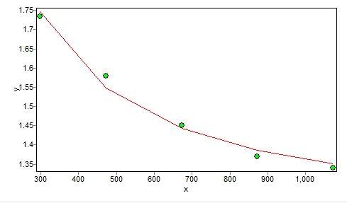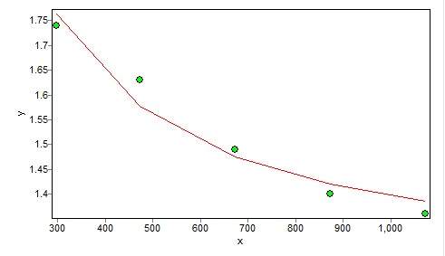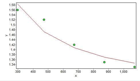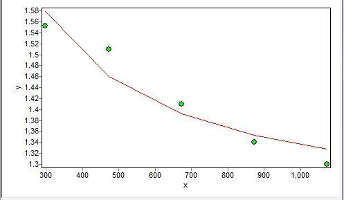 均方差(RMSE): 0.0166330356441843 残差平方和(SSE): 0.00138328937370353 相关系数(R): 0.992803768743302 相关系数之平方(R^2): 0.985659323230904 决定系数(DC): 0.985526033247728 卡方系数(Chi-Square): 0.000442346340380584 F统计(F-Statistic): 206.195148060588 参数 最佳估算 ---------- ------------- A 525.805717177879 a1 7213.56939658239 ====== 结果输出 ===== No 实测值y 计算值y 1 1.74322 1.7557642 2 1.6 1.5687255 3 1.47 1.4677259 4 1.4 1.4127136 5 1.37 1.3790017 |