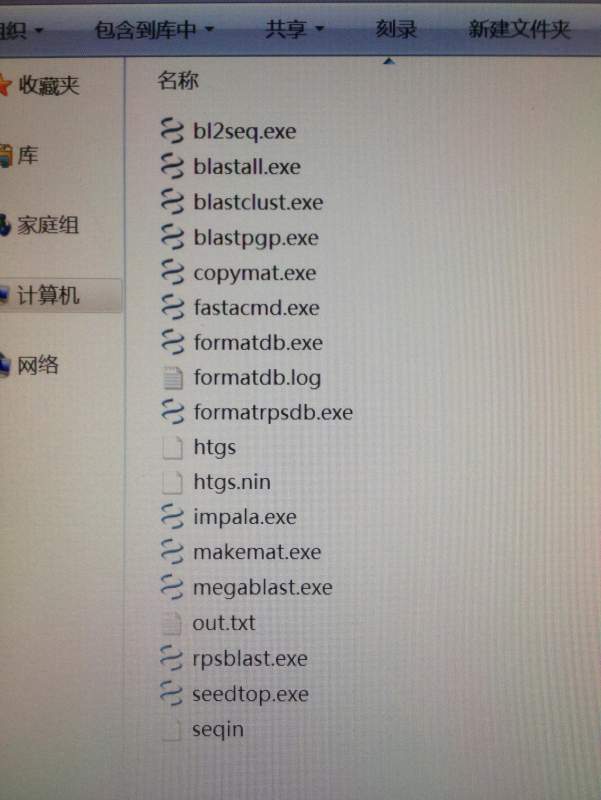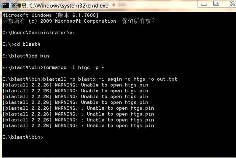 我下载了htgs的一个数据库,解压后出现了好多文件(如图),我用了htgs.00.nsq,复制到bin文件夹里面,去了扩展名,先输入formatdb -i seqin -p F,出现了htgs.nin,在输入blastall -p blastx -i seqin -d htgs -o out.txt,却显示如图。求指点我哪里做错了,正确的步骤是怎样的,谢谢!