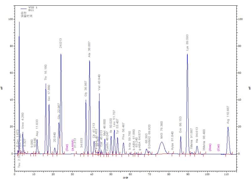 4、检测的是:P-Ser磷酸丝氨酸、Tau牛磺酸、PEA磷酸乙醇胺、Urea尿素、Asp天冬氨酸、Thr苏氨基、Ser丝氨酸、Glu谷氨酸、α-AAAα-氨基乙二酸、Gly甘氨酸、Cit瓜氨酸、Ala丙氨酸、α-ABAα-氨基丁酸、Val缬氨酸、Cys半胱氨酸、Met蛋氨酸、Cysthi胱硫醚、Ile异亮氨酸、Leu亮氨酸、Tyr酪氨酸、Phe苯丙氨酸、β-Alaβ-丙氨酸、β-AiBAβ-氨基异丁酸、g-ABAγ-氨基丁酸、EOHNH2乙醇胺、Hylys羟赖氨酸、Orn鸟氨酸、Lys赖氨酸、1Mehis1-甲基组氨酸、His组氨酸、3Mehis3-甲基组氨酸、Car肌肽、Arg精氨酸、Hypro羟脯氨酸、Pro脯氨酸,共35 种游离氨基酸的含量。