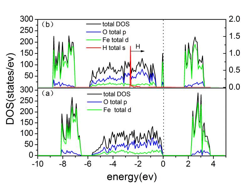 不能说是能带减小了。带隙中的峰来自你掺杂的H导致的缺陷态,费米能级"钉扎"在缺陷能级了。 你的H间隙靠近什么原子?从你的DOS图来看,似乎是靠近Fe原子。你检查H在不同间隙位置了吗?比较它们的稳定性了吗? 另外你的H间隙浓度是多少?简单的拿出一张图,不能描述清楚问题。 |