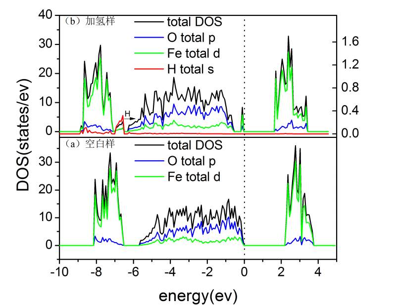 各位大侠: 之前我也曾发表过一个类似的贴子,结果没有人回复,也不知道是肿么回事?我是用VASP对Fe2O3中的间隙H掺杂进行研究,掺杂后利用origin画出来的DOS图如下图所示,不知道怎么解释费米面附近的变化啊!急求比较懂的高人帮忙解答一下,我自己也在尽力的寻找解决办法。多谢! 超胞对比图1.jpg |