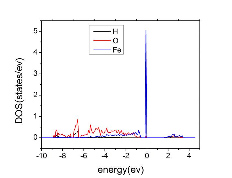 "从你的DOS图来看,似乎是靠近Fe原子." 这个评论有点不正确。 态密度显示H间隙原子靠近O,因为你的态密度图中,H的s态与O的p态有重叠。 建议你画出与H靠近的O以及与该O靠近的Fe原子的分波态密度。那个带隙中的杂质态,是因为H间隙影响了与之相邻的O原子的价态,以及Fe的晶体场,从而与该O相邻的Fe的价态也略有变化。你可以先看未掺杂H间隙前,Fe2O3中的Fe是什么配位场(四面体、或八面体等,这个从原子结构就可以大致看出来的),以及画出Fe原子的分波态密度。另外对比这个这个特定Fe原子(即与H靠近的O以及与该O靠近的Fe原子)的Fe-O键长、O-Fe-O键角在H间隙掺杂前后的变化。 还有,你也可以做个Bader charge analysis,看这个特定Fe原子的电荷有无变化,若有变化,变化大致是多少。通过这些就可以大致分析出那个带隙中杂质态的起源。 |