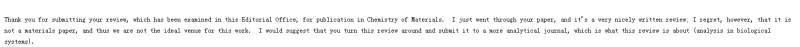 | Thank you for submitting your review, which has been examined in this Editorial Office, for publication in Chemistry of Materials. I just went through your paper, and it's a very nicely written review; I regret, however, that it is not a materials paper, and thus we are not the ideal venue for this work. I would suggest that you turn this review around and submit it to a more analytical journal, which is what this review is about (analysis in biological systems). |