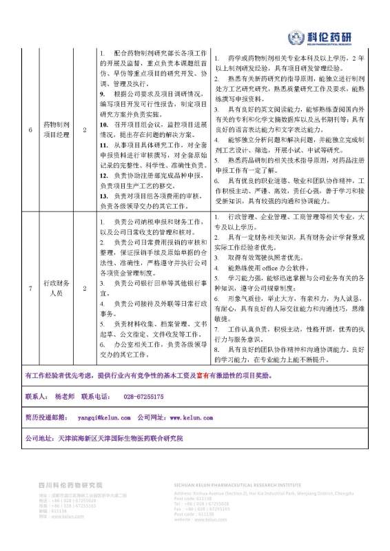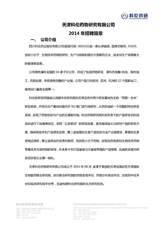 天津科伦药物研究有限公司 2014年招聘简章 一、 公司介绍 四川科伦药业股份有限公司(股票代码:002422)是一家从事输液、品牌仿制药、NDDS、创新小分子、生物技术药物的研究、生产与销售的国内大型医药企业,是全球生产规模最大的输液制造商。 公司拥有遍布全国的34家子分公司,形成了包括药物研发、原料药发酵/合成、制剂加工、药品包装、市场销售完整的产业链。公司产品已向欧洲、亚洲、非洲的22个国家出口,输液出口量居全国第一。 科伦的研发网络是以成都中央研究院和天津及苏州两个研发基地为主的“两翼一主体”研发系统,并依托生产基地和国内外BD部门进行辅研究,从而形成的一个完整的网状研发系统,实现了药物创新与产业的无缝隙对接。科伦药物研究院对新形势下的产品研发和科技创新进行了战略再定位,采用“三发驱动”的研发战略,首先继续加大注射剂产品的研发力度,确保其技术和产品领先优势;第二是加强抗生素产品创新与全产业链建设,掌握抗生素领域话语权;第三是突出对优秀仿制药、创新型小分子药物、新型给药系统和生物技术药物等高技术内涵药物的研发,在未来十年打造输液与非输液等强的产品格局,迅速跻身国内研发创新型企业第一梯队。 天津科伦药物研究有限公司成立于2014年08月,坐落于美丽的天津滨海新区天津国际生物医药联合研究院,依托联合研究院的药物发现平台、药物分析测试平台、生物药中试平台和临床研究院平台等,迅速构建科伦研究院的北方研究机构。 二、 招聘职位 详见附图 三、 薪酬福利待遇 ◆ 收入:行业内具有竞争性的基本工资+富有激励性的项目奖励 ◆ 报到后签订劳动合同 ◆ 提供单身集体宿舍 ◆ 缴纳五险一金 ◆ 提供各种培训机会 ◆ 免费工作餐 ◆ 生日礼品礼金 ◆ 部门活动经费 ◆ 带薪休假 ◆ 旅游 ◆ 体检 2014招聘简章0722.jpg 2014年天津科伦药物研究招聘简章_页面_1.jpg 2014年天津科伦药物研究招聘简章_页面_2.jpg 2014年天津科伦药物研究招聘简章_页面_3.jpg 2014年天津科伦药物研究招聘简章_页面_4.jpg 2014年天津科伦药物研究招聘简章_页面_5.jpg 2014年天津科伦药物研究招聘简章_页面_6.jpg 2014年天津科伦药物研究招聘简章_页面_7.jpg [ Last edited by zhangxiang169 on 2014-7-24 at 16:37 ] |