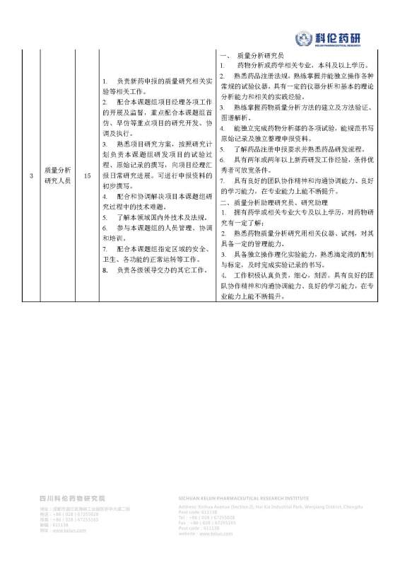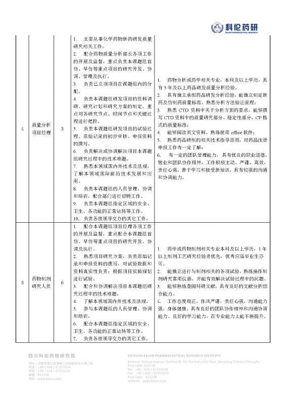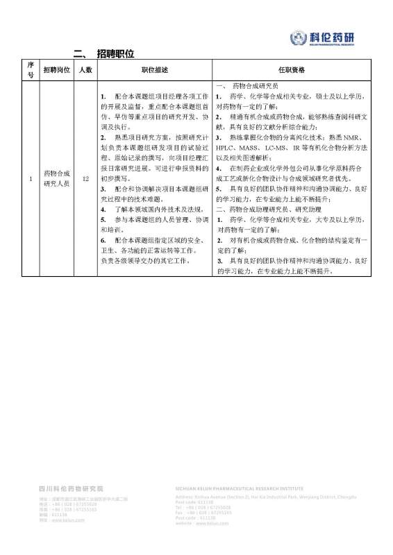 四川科伦药物研究院招聘药物合成、质量分析研究人员若干名