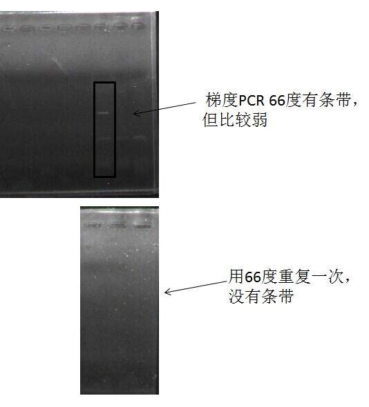 最近在拉一个基因的CDs部分,不知道是什么原因,用梯度PCR优化退火温度,根据梯度PCR结果设定的温度,就木有带的情况。两次所用的PCR条件是完全一致的。 我这是用oligo(dT) 引物反转录的cDNA模板,换了好多引物都出现类似的结果。 基因的GC搞会不会出现这样的情况? 还是说是模板的原因? 总共就1kb多的基因CDs,扩不出来真是说不过去啊。 哪位有经验的还望指点一下 gel.jpg |