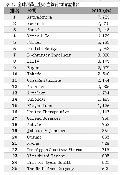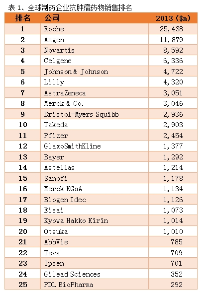 重点治疗领域全球制药企业排名 全球制药企业排名榜单并不鲜见,每年各大公司年报一经发布,便有研究机构会统计其销售额并进行业绩排名。但如果把各公司销售业绩再拆分,细分不同的治疗领域进行排名,则并不常见。本文我们将为大家介绍抗肿瘤、免疫系统疾病、代谢疾病等主要治疗领域全球制药企业2013年销售额排名情况,供大家参考。本文数据由GlobalData统计处理,金额单位百万美元。 抗肿瘤领域 抗肿瘤药物领域,罗氏(Roche)公司可谓一家独大,2013年抗肿瘤相关药物销售额达254亿美元。罗氏的霸主地位主要得益于收购基因泰克(Genentech)获得了赫赛汀、阿瓦斯汀、美罗华等重磅抗肿瘤单抗药物产品。紧随其后,安进(Amgen)公司以119亿美元的销售额位列第二,其余制药企业在抗肿瘤领域的销售额则呈现快速下降趋势,排名第25名的PDL BioPharma销售额仅为2.92亿美元,行业集中度较高。 免疫系统疾病领域 免疫系统领域,艾伯维(AbbVie)凭借113亿美元的销售额位居榜首,也是该治疗领域唯一一家销售额过百亿美元的公司,此外,罗氏(Roche)、强生(Johnson & Johnson)也有着不错的表现。 代谢疾病领域 代谢疾病领域,全球前几名厂商均在糖尿病领域有充分的布局,如赛诺菲(Sanofi)、诺和诺德(Novo Nordisk)、礼来(Lilly)为全球三大胰岛素巨头,默克(Merck & Co.)则凭借口服降糖药捷诺维成为抗糖尿病领域的新星。 中枢神经系统(CNS) 中枢神经系统领域,辉瑞(Pfizer)、大冢(Otsuka)、百健艾迪(Biogen Idec)、诺华(Novartis)、梯瓦(Teva)2013年该领域销售额分别位列前五名,均在50亿美元以上。 心血管领域 2013年心血管领域药品销售额超过50亿美元的公司同样有5家,分别是阿斯利康(AstraZeneca)、诺华(Novartis)、赛诺菲(Sanofi)、默克(Merck & Co.)、辉瑞(Pfizer),前5大企业销售额合计333亿美元。 |