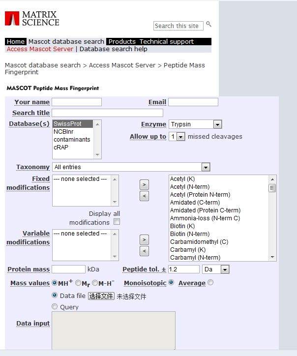 楼主这样明显把问题复杂化了,要是这样,你要用肽指纹图谱(PMF)进行搜索了,你完全可以直接不酶切做MALDI-TOF-MS,分子量就直接出来了。用要用肽指纹图谱(PMF)进行搜索实际上用于未知的蛋白质的鉴定,即从蛋白质数据库中找到与库中的同样的酶切片段的各个肽段的分子量信息与实验的蛋白质最为匹配的蛋白质是谁,然后鉴定出未知的蛋白质的身份信息。 我另外提供给楼主简单些的肽指纹图谱(PMF)为基础的未知蛋白质的身份确定的搜索方法。可以用:Mascot软件,从网上其搜索界面直接填好信息提交给Mascot,它自己就会完成搜索并给于你搜索的可能的匹配的蛋白质的信息。 Mascot软件的PMF提交界面就是:http://www.matrixscience.com/cgi ... &SEARCH=PMF ,楼主写对了,然后你按照界面的要求把信息填好提交就行了。可以参考:参见:薛庆中 等编著,DNA和蛋白质序列数据分析工具,科学出版社,2012,第三版,146-151,该书用的是http://www.matrixscience.com/cgi ... &SEARCH=MIS 提交界面,操作大同小异。 DNA和蛋白质序列数据分析工具_(第三版)下载:http://muchong.com/bbs/viewthread.php?tid=7614763 Mascot网上提交界面(PMF).JPG |