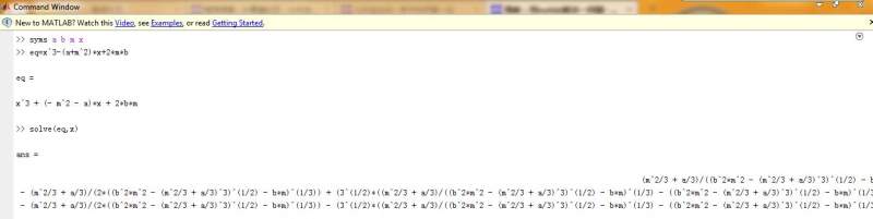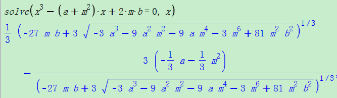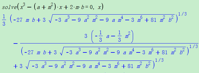 >> syms a m b x >> A=solve('x^3-(a+m^2)*x+2*m*b=0',x) A = (m^2/3 + a/3)/((b^2*m^2 - (m^2/3 + a/3)^3)^(1/2) - b*m)^(1/3) + ((b^2*m^2 - (m^2/3 + a/3)^3)^(1/2) - b*m)^(1/3) - (m^2/3 + a/3)/(2*((b^2*m^2 - (m^2/3 + a/3)^3)^(1/2) - b*m)^(1/3)) + (3^(1/2)*((m^2/3 + a/3)/((b^2*m^2 - (m^2/3 + a/3)^3)^(1/2) - b*m)^(1/3) - ((b^2*m^2 - (m^2/3 + a/3)^3)^(1/2) - b*m)^(1/3))*i)/2 - ((b^2*m^2 - (m^2/3 + a/3)^3)^(1/2) - b*m)^(1/3)/2 - (m^2/3 + a/3)/(2*((b^2*m^2 - (m^2/3 + a/3)^3)^(1/2) - b*m)^(1/3)) - (3^(1/2)*((m^2/3 + a/3)/((b^2*m^2 - (m^2/3 + a/3)^3)^(1/2) - b*m)^(1/3) - ((b^2*m^2 - (m^2/3 + a/3)^3)^(1/2) - b*m)^(1/3))*i)/2 - ((b^2*m^2 - (m^2/3 + a/3)^3)^(1/2) - b*m)^(1/3)/2 >> pretty(A) +- -+ | #2 | | -- + #1 | | #1 | | | | 1/2 / #2 \ | | 3 | -- - #1 | i | | \ #1 / #2 #1 | | ------------------ - ---- - -- | | 2 2 #1 2 | | | | 1/2 / #2 \ | | 3 | -- - #1 | i | | #2 \ #1 / #1 | | - ---- - ------------------ - -- | | 2 #1 2 2 | +- -+ where 2 2 3 1/2 1/3 #1 == ((b m - #2 ) - b m) 2 m a #2 == -- + - 3 3 >> |