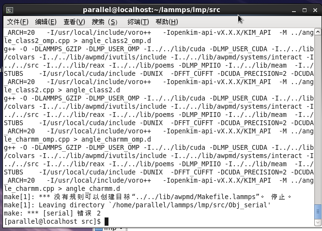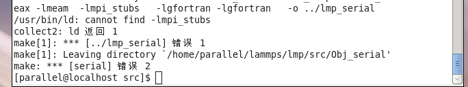最近看了网上关于lammps并行安装的资料,用自己笔记本装的,现在root用户下安装了fftw和mpic好,没有报错,然后在 子用户 下安装lammps,最后一步make serial的时候报错,如图,麻烦好心人帮忙看看问题出在哪? 感激不尽! Screenshot2.png |