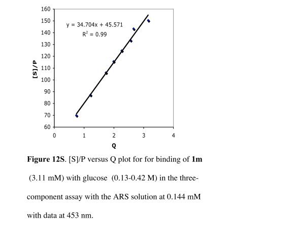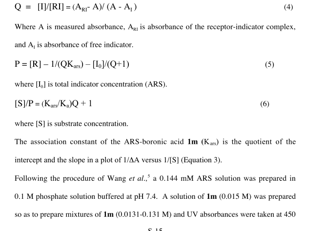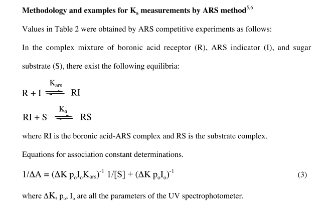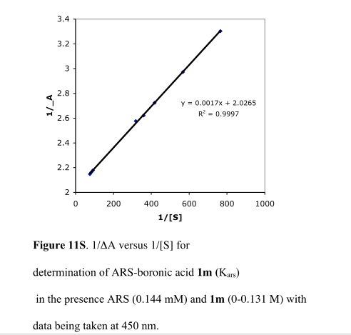 最近在测定硼酸类化合物与糖在不同PH条件下的结合常数,采用ARS竞争法,但是第一步能做出线性,第二步却怎样也做不出线性。文献中都可以做出线性,求大神帮助!!!! 参考文献如下 公式1.png 公式2.png 第一步图.png 第二步图.png |