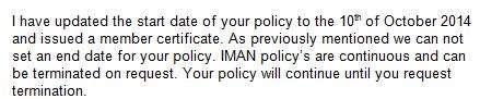 最近申请402签证 购买IMAN的保险 对方已经给我发来电子凭据 只有start date 没有end date 我是分期按季度付款的 我咨询过很多次 我说能不能写上end date 他们说他们是连续保险 直到我email要求他们 他们才会停止 但是签证要求上写的是要cover整个在澳洲的时期 请问这样对签证有影响吗 有没有遇到相同情况的同学 求助求助啊 不甚感激 iman.JPG |