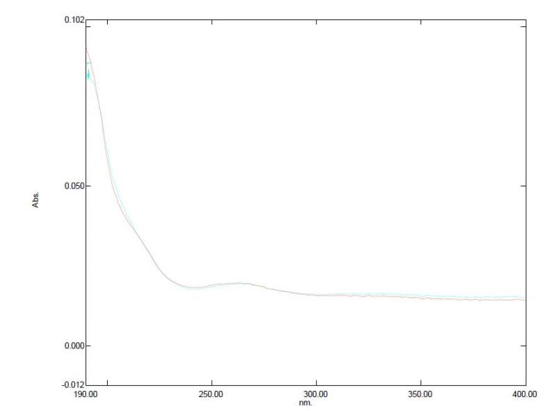紫外走基线归零后,扫毛发现400nm处的值为0.013,最大吸收峰在265nm处