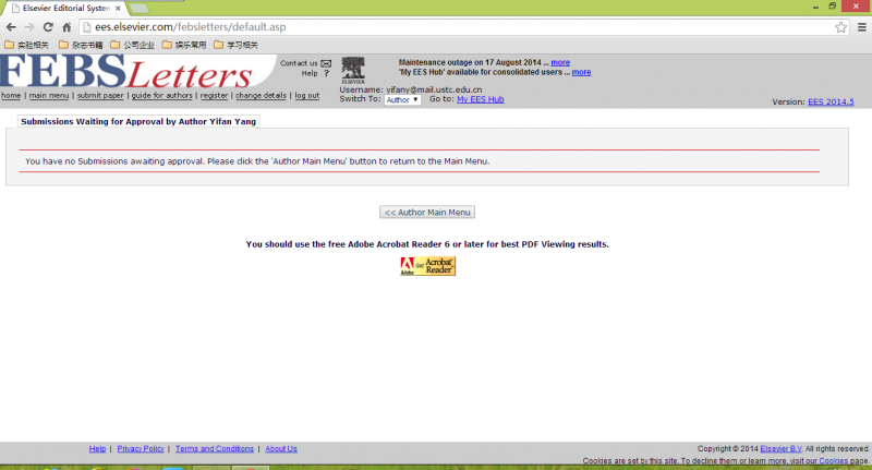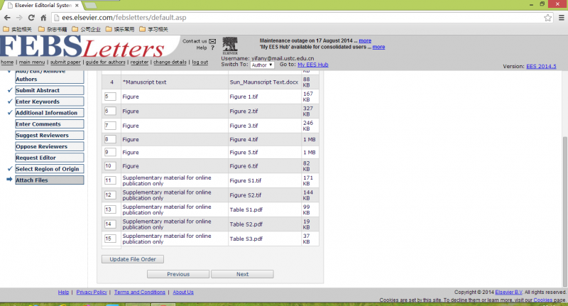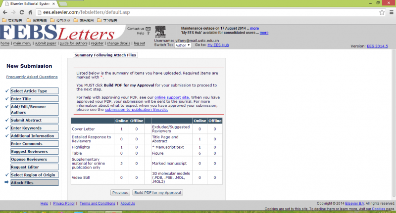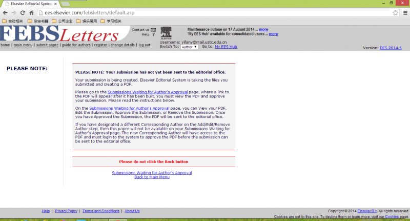 我最近几天想把文章投到FEBS letter,用了那个杂志自己的在线投递系统,上传完了所有文件,最后要我确认生成的PDF,但是最后显示我并没有任何递交的稿件,点击主界面也显示没有待确认的稿件,这是为什么呢?好着急,已经弄了一天了。急求助!我把上传一步步的照片给大家传上来,从1到5,大家谁能帮我看看是怎么回事。 1.png 2.png 3.png 4.png 5.png |