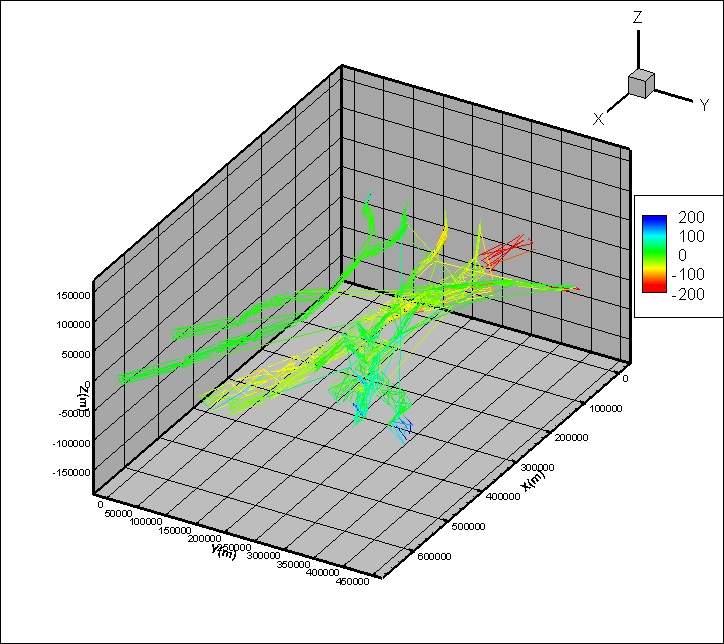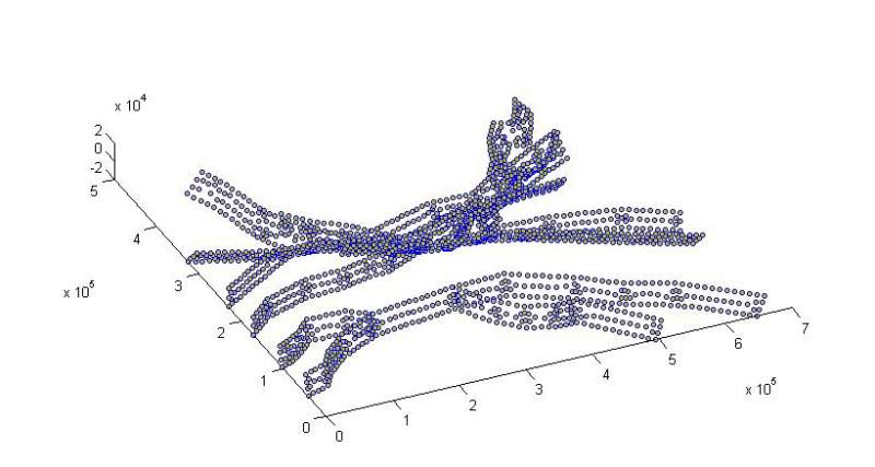计算得一组数 n行4列,列分别为: X坐标, Y坐标, Z坐标, V值,数据见附件data.txt。坐标X Y Z在空间内分布不均匀,如图所示。但点是分布在空间内纵横交错的一些面上的。 现在想在这些纵横交错的面上画出V值,其他空白区域不要。请问大侠该怎么处理呢? |