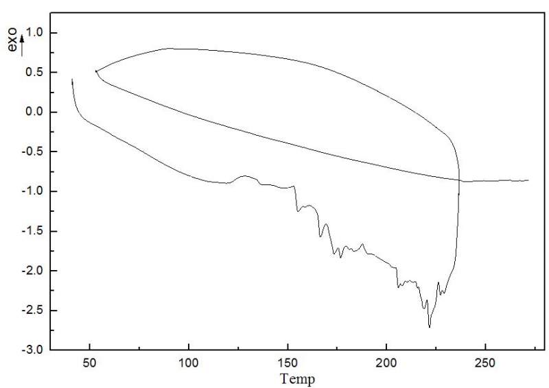 请分析我的DSC图。 样品是不饱和树脂的共聚反应产物。 测试程序:先从室温升到到250度,平衡后,降温到室温,在从室温升高到270度。如图所示。 请求解:最后部分,从室温升高到270度,怎么一直是向下的斜线?这表明什么物理意义? 谢谢! DSC.JPG |