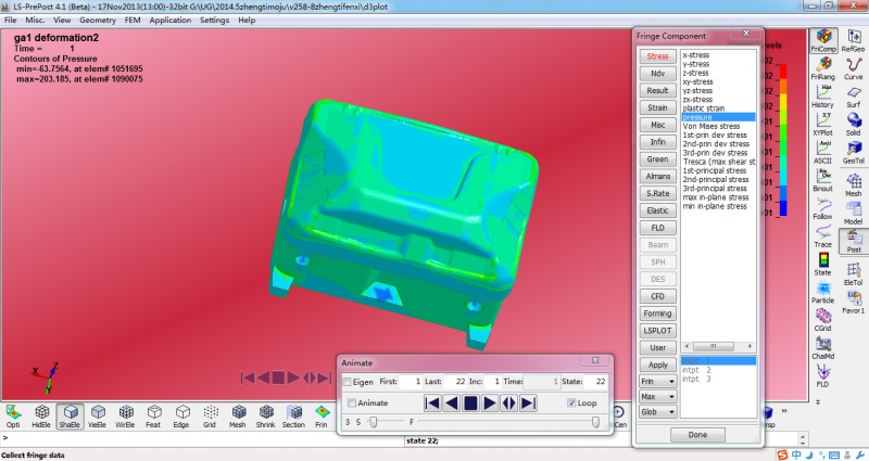在做模具冲压分析的实验中,如何测在冲压过程中压强的变化,用什么测,怎样测? 比如说在ls-dyna中给模具做了分析求解后,到ls-prepost中能看到模具的位移及应力变化,在应力变化栏中有pressure,这个能查看压强,这个压强变化可以看出来,可是实际给模具做实验时用什么来测这个压强?如何测这个压强? 5.PNG |