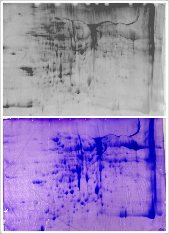 上面这张图是我用Pro-Q Diamond 染的,下面这张图是我用这块胶进行了考马斯亮兰染色。这张图总觉得很不好,特别是Rubisco蛋白都没有染上。求指教。谢谢各位。