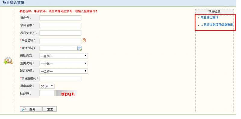 ,点击“项目资助”下栏中的“项目申请与资助情况”,然后进入综合查询。如下图所示
