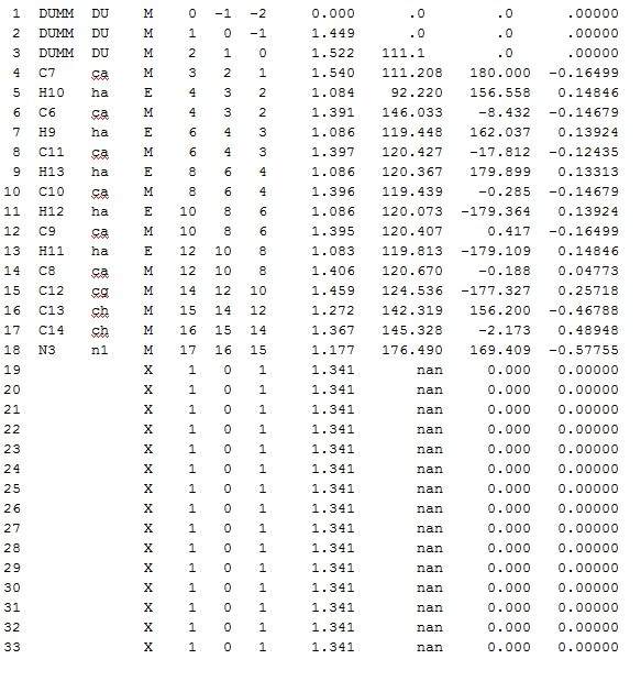 但是在第二步的时候出现了问题,生成的prepin文件如图e.prepin。也就是只识别了那个小分子的一部分,另一部分没有识别。求大神解答,这到底怎么回事?谢谢。