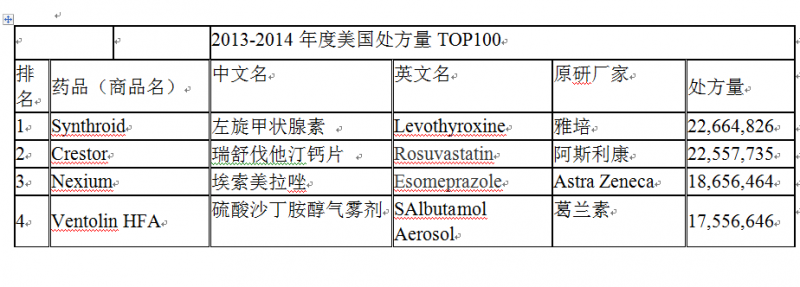 2013-2014美国处方量TOP100 药品 (商品名+原研公司+销售额+活性成分)