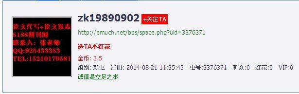 ID zk19890902 2014年8月21 刚注册,就利用头像和大量回帖发布论文代写广告, 对其全坛永久禁止访问,特此备案。 回帖情况: https://muchong.com/bbs/space.php?uid=3376371&view=post 头像广告 |