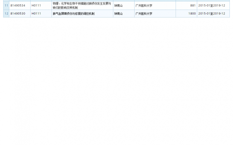 代码 项目名 关键词 负责人 依托单位 经费▼ 起始时间 基金 H0111 肺气血屏障损伤与修复的调控机制 钟南山 广州医科大学 1800 201501 医学 H0111 物理、化学和生物干预措施对肺损伤发生发展与转归的影响及其机制 钟南山 广州医科大学 881 201501 医学 H0111 病原体感染导致肺气血屏障损伤的关键机制和干预新靶点 蒋澄宇 中国医学科学院基础医学研究所 339 201501 医学 H0111 生长因子和干细胞在肺损伤肺气血屏障修复中的作用和机制 白春学 复旦大学 304 201501 医学 情况应该就是这样的,上述4个子课题总和正好1800万 |