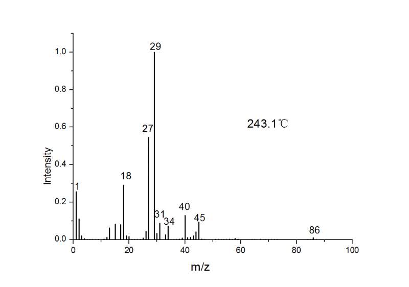 四种物质(异丙醇铝,二缩三乙二醇,磷酸,三乙胺)混合均匀的凝胶,直接进行TG-MS(离子源为EI)测试,得到的其中一张质谱图,求大家帮忙分析,各质荷比代表的碎片离子峰(m/z=1,2,13,15,17,18,27,19,31,34,40,45,86)以及各碎片的来源,不胜感激。。。 质谱.jpg |