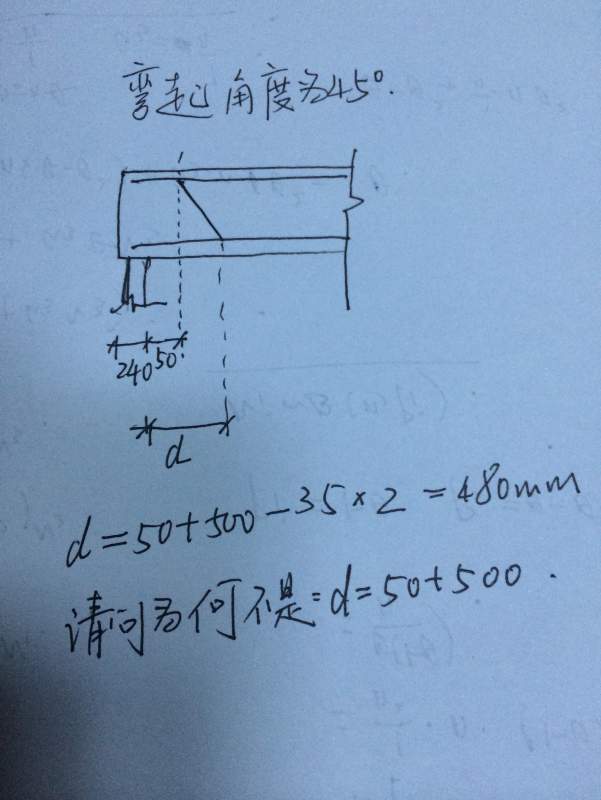 梁总高500,而纵筋弯起前和弯起后分别距离梁底与梁顶分别是as与as‘,所以弯起段的投影长度就等于h-as-as'