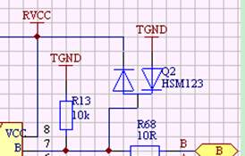 这两个二极管是用来做端口保护的,以避免高压损坏65LBC184。 当外部进来的电压高于RVCC,则左边的二极管导通,使B脚电压拉低维持在稍高于RVCC。 当外部进来的电压低于TGAND,则右边的二极管导通,使B脚电压拉高维持在稍低于TGND。 其它时候两个二极管不导通。 HSM123是两个二极管做在一个封装里,外表看起来像个三极管。 之所以要用高速管,是希望它一旦高压进来,立即导通起到保护作用。 如果不是高速的,可能在它导通前芯片已经被打坏了。 |
