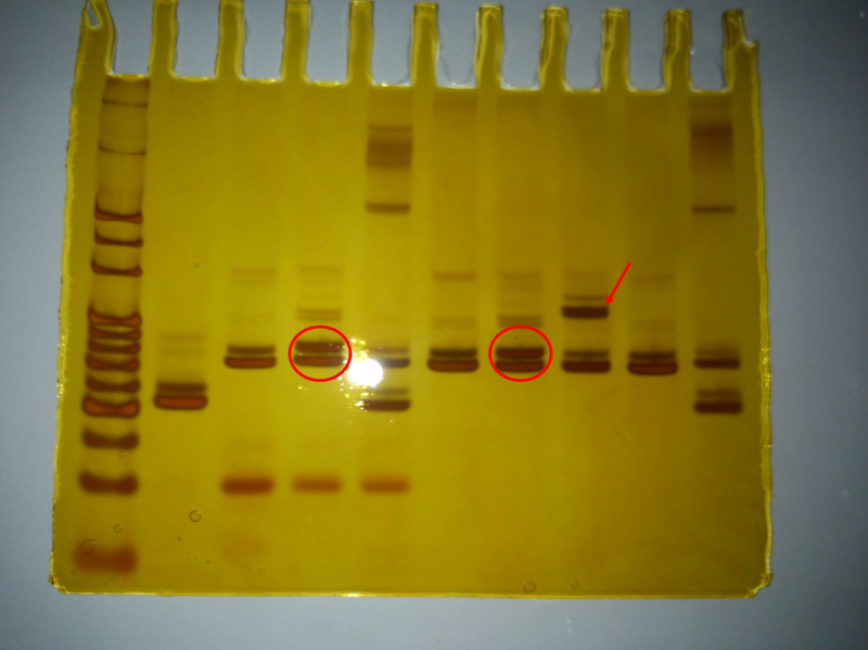 棉蚜微卫星引物测基因型,跑出来的胶怎么区分影子带和主带?超出引物给定的size range 的条带可以算主带吗? 如图中所示,红色圆形内的带是两条主带还是一条主带一条影子带?并求指导各个孔的主带有几条? 红色箭头所指的带超出了引物的size range,引物的size range是114-155,这条带在200以上,可以算是一条目标主带吗? 图片1.png |