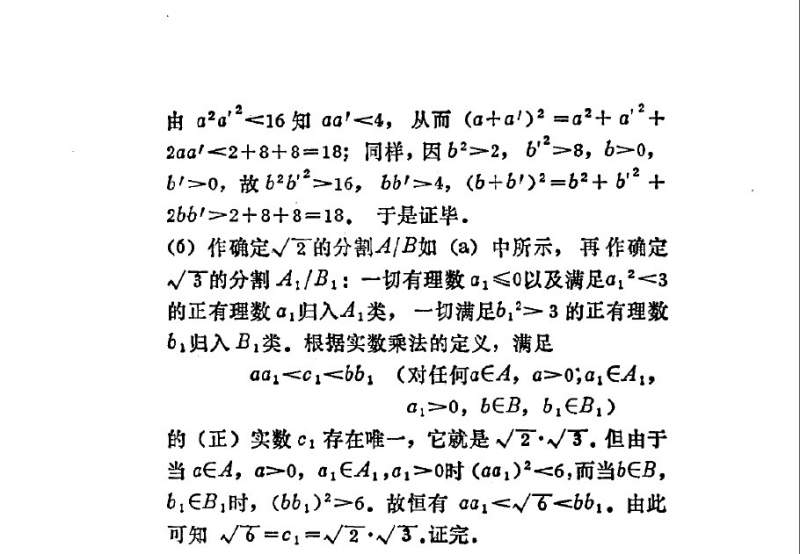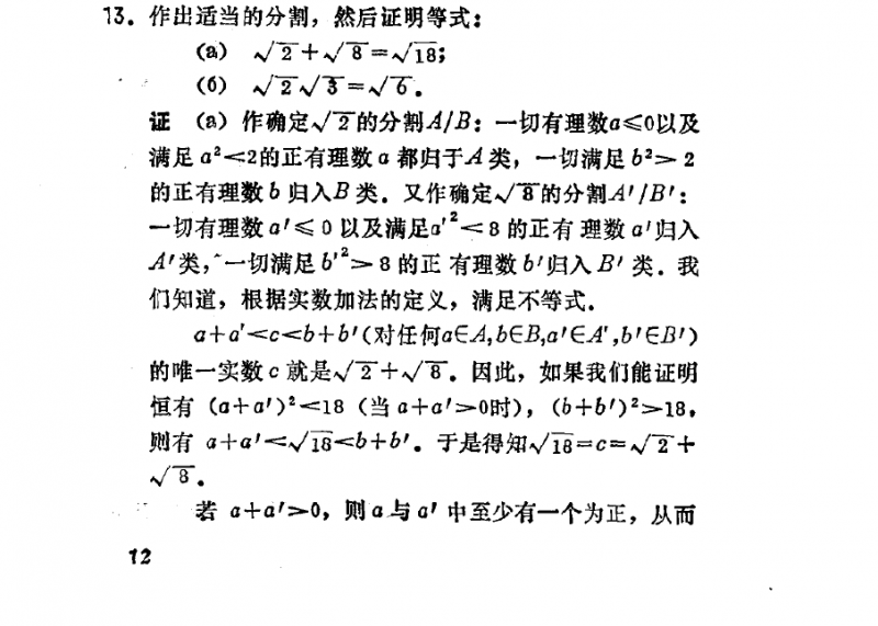 用戴德金分割的方法证明 根号2+根号8=根号18 根号2×根号3=根号6 希望能有详细的论证……谢谢了 |