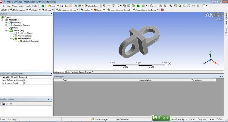 初接触workbench,随便找了个零件试分析该零件的基频:没加约束,只划分了网格,如图所示,按理说:运行结束后单击solution,在右下角应该会显示分析结果,但是却没有,求原因?