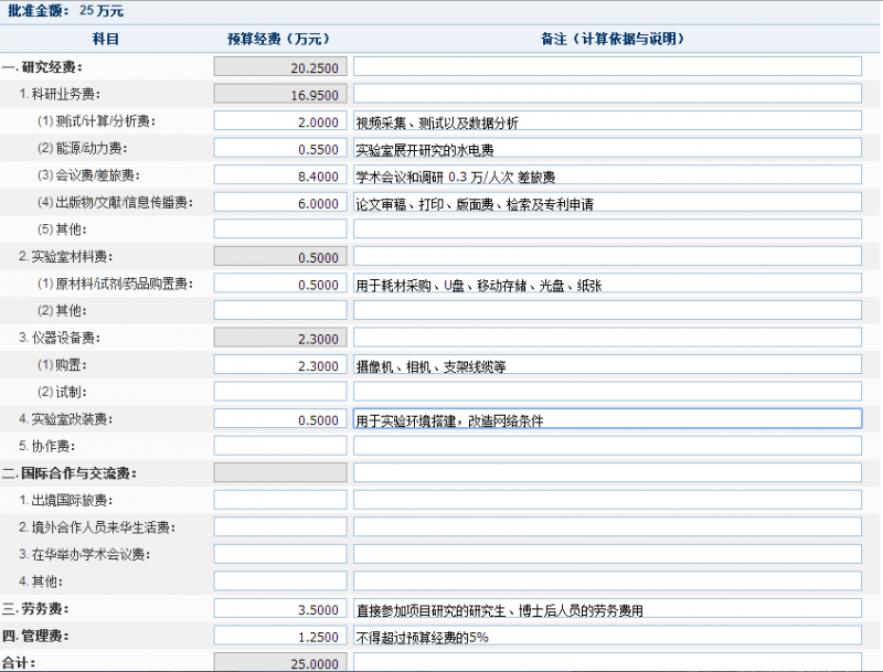 我申请30万,批了25万,没办法,我把测试计算分析费减了2万然后就是国际交流费用减掉,其他的都是微调。