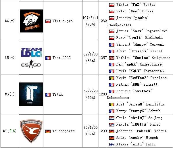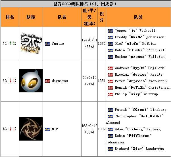 世界CSGO战队排名(9月1日更新)