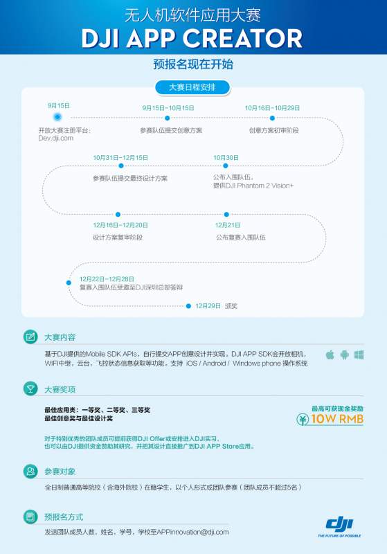 大赛内容: 基于DJI公司(深圳大疆创新科技有限公司)提供的Mobile SDK APIs,自行提交软件APP创意设计并实现。届时DJI APP SDK会开放相机,WIFI中继,云台,飞控状态信息获取等API功能接口,支持iOS/Android/ Windows phone三种操作系统。 大赛奖项: 大赛设置最佳应用类一等奖、二等奖、三等奖以及最佳创意奖与最佳设计奖等,最高可获10万元人民币现金奖励。 对于特别优秀的团队成员可提前获得DJI Offer或安排进入DJI实习,也可以由DJI提供资金赞助其研究,并把其设计直接推广到DJI APP Store应用。 参赛对象: 全日制普通高等院校(含海外院校)在籍学生,以个人形式或团队参赛(团队成员不超过5名) 预报名方式: 发送团队成员人数、姓名、学号、学校至APPinnovation@dji.com 赶紧占位报个名吧! 预报名.jpg |