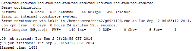 本人一直在优化某一团簇的结构,但是尝试过几次之后总是以失败告终,结尾总是提示 Error in internal coordinate system. Error termination via Lnk1e in /home/users/test2/g09/l103.exe at Tue Sep 2 06:53:12 2014 求指点。 log文件结尾.png |