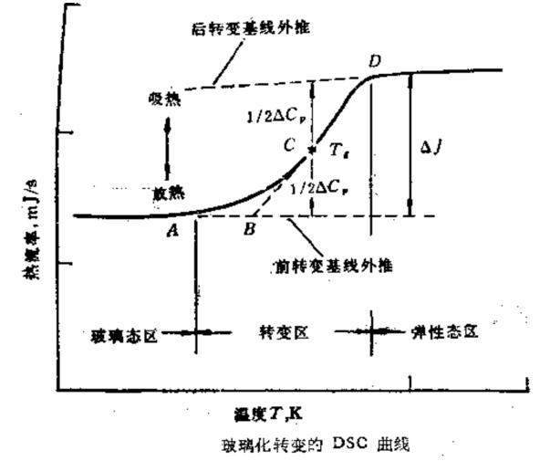 DSC测定玻璃化转变温度Tg就是基于高聚物在玻璃化温度转变时,热容增加这一性质.在DSC曲线上,其表现为在通过玻璃化转变温度时,基线向吸热方向移动,如附图所示.图中A点是开始偏离基线的点。把转变前和转变后的基线延长,两线间的垂直距离△J叫阶差,在△J/2处可以找到C点。从C点作切线与前基线延长线相交于B点。ICTA建议用B点作为玻璃化转变温度Tg,实际上,也有取C点或取D点作为Tg的。