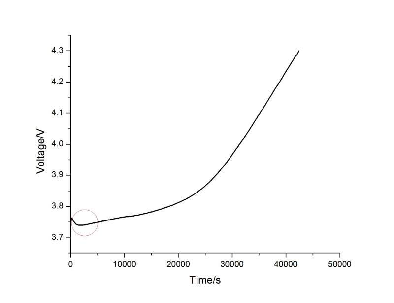 镍钴锰三元材料正极半电池,恒流充电,第一次充电时电压先升高,然后突然降低,往下拐一下(见附图),之后就正常了,第二个循环之后也正常,没有这种情况了,这是什么原因呢?有朋友也遇到这种问题并找到原因解决了吗?
