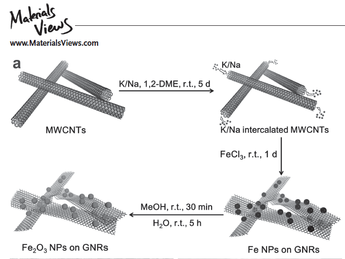 the obtained GNRs/Fe composite was washed with deionized water, oxidizing the Fe NPs to iron oxide NPs 在流程图中,Fe纳米颗粒为什么通过甲醇洗涤,水洗之后得到了Fe2O3 ? 1212.png |