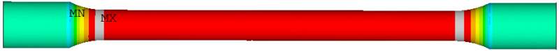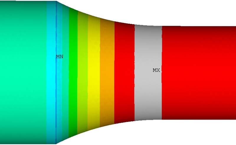 请教各位大侠,我用ANSYS14.0模拟钛棒拉伸,寻找其最大应力位置(即颈缩)。ANSYS的主要参数有:solid187,E=110 GPa,v=0.35,两端施加100 MPa的均布载荷。模拟结果显示,最大应力的位置不在中间部位,而在倒角部分靠近内侧端。请问,这个现象对吗?谢谢!