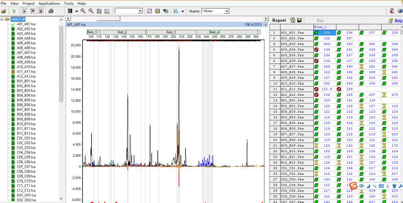 本人做的是植物ssr,现在做到荧光引物跑板之后,用genemarker软件处理如图,但是后面的处理我就不知道了,我想问一下,选取右侧这样的数据具体怎么处理,不会要一个个选取吧,有没有简单的方法,批处理。一般要选取2个值,本人确实不知道怎么搞了,求帮助,大神帮助一下