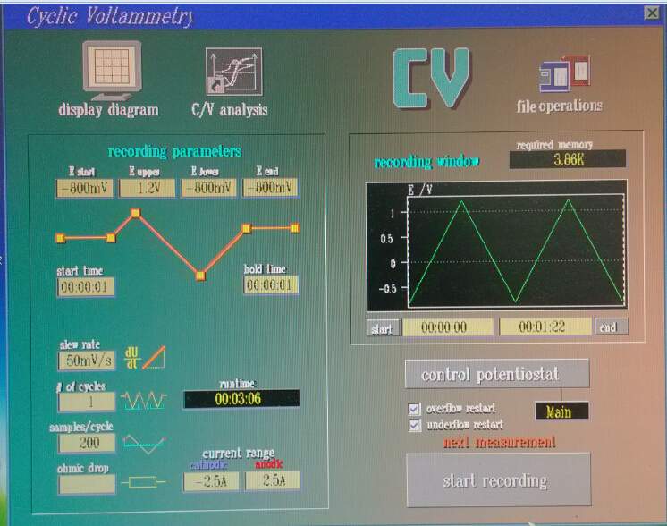 电化学工作站用的是德国zahner,溶液是碘,碘化锂和高氯酸锂的乙腈溶液。测试设置和结果如截图所示,中间一段是平的,这是什么原因?还有两对氧化还原峰都没有出现,用过国产电化学工作站测试两对峰明显,初步怀疑是仪器参数没有设置正确,有没有大神指导如何设置仪器参数?