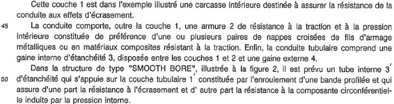 第二段具体翻译: 管道包括:包覆着管道1的保护层2,它可以抗压缩和抗拉伸。保护层2的内部通常含有1层或多层用以抗拉伸的金属丝或复合材料丝构成的网状层。最后,这两层套管的外面会加上一层用以密封的套管3(位于层1和层2中间)和外部套管4。 第三段: 在图2所示的“smooth bore”套管样式中,密封管3'包覆的是1’层,这个1’层是由缠绕型钢形成的,一方面起到加强抗破碎强度的作用,另一方面还能抵抗内部压力带来的周向分量。 |
