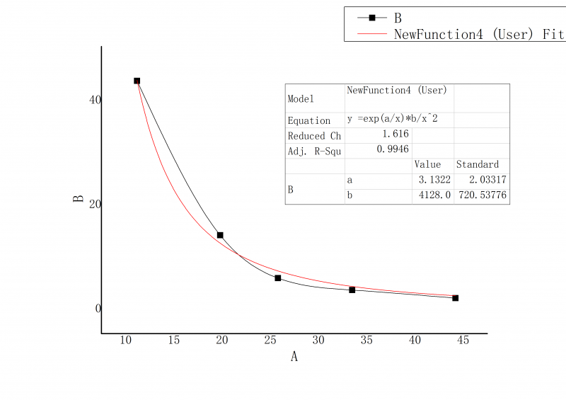 可以用1stOpt试一下。 代码: 结果: "AFIT" 迭代数: 101 计算用时(时:分:秒:微秒): 00:00:00:136 优化算法: 改进差分进化算法 计算结束原因: 达到收敛判断标准 均方差(RMSE): 0.984683239881095 残差平方和(SSE): 4.84800541451365 相关系数(R): 0.998167463622668 相关系数之平方(R^2): 0.99633828543491 决定系数(DC): 0.995947435509867 卡方系数(Chi-Square): 0.351528783857871 F统计(F-Statistic): 816.28832700427 参数 最佳估算 ---------- ------------- a 3.1322146172875 b 4128.0956944299 ====== 结果输出 ===== No 实测值y 计算值y 1 43.41 43.5280671 2 13.84 12.3345007 3 5.63 7.0022125 4 3.35 4.0389290 5 1.81 2.2681998 |