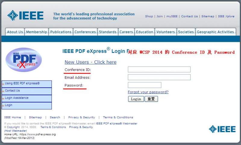 用 IEEE PDF eXpress 提交 WCSP 2014 的 论文时 需要的Conference ID 及 Password 已有4人参与
